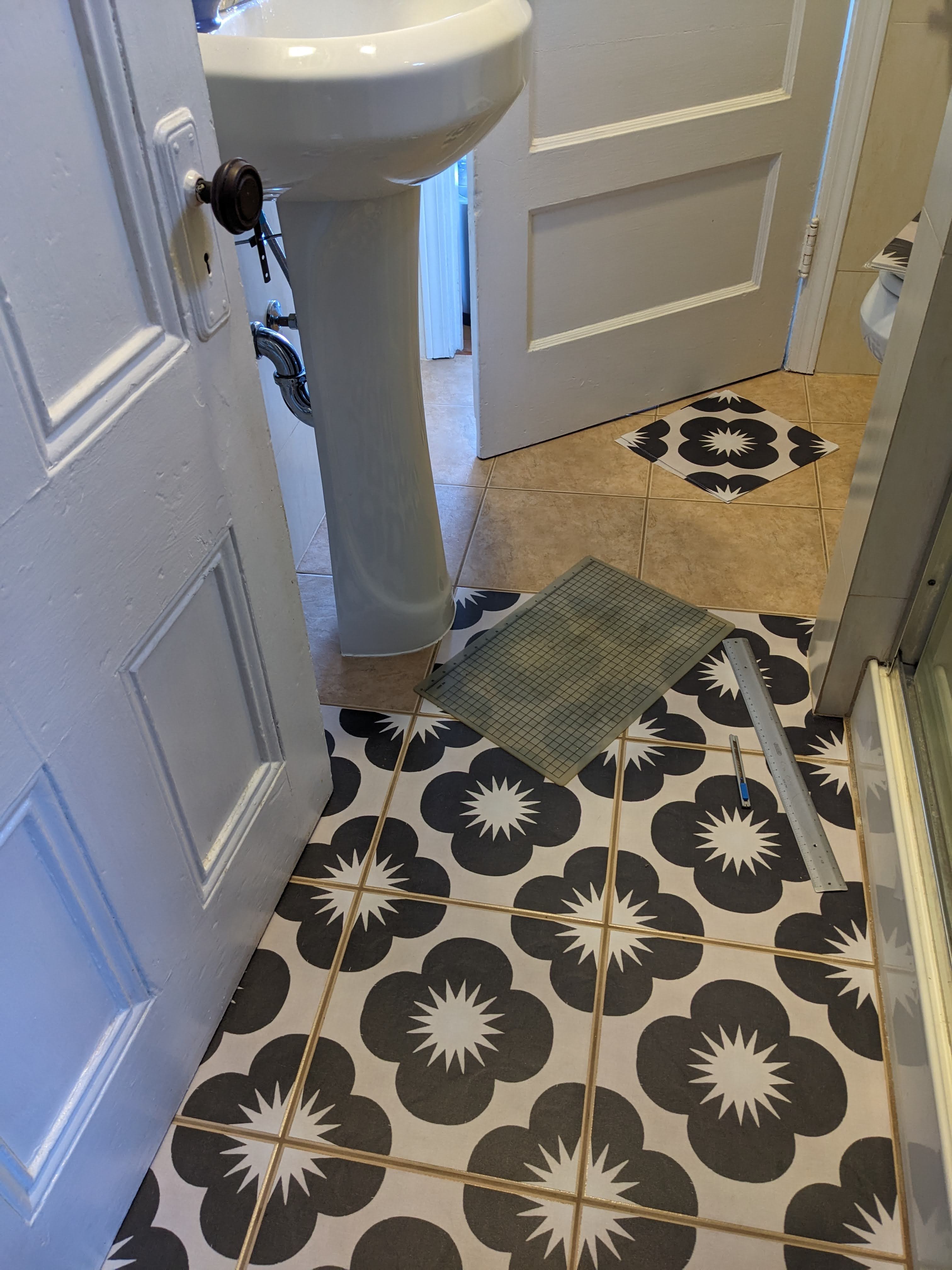 Between scrubbing the floor really well beforehand, and the work to stick 30 of these bad boys down, I think I spent about four hours on this project. I found them a little fiddly to trim around the curved foot of the sink and toilet, but it really wasn't too bad.