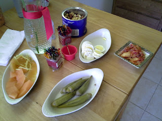 Two types of cantaloupe by Adrienne, okra by Adrienne, eggs by me, and some amazingly fantastic kimchi that Susie brought for the festivities!
